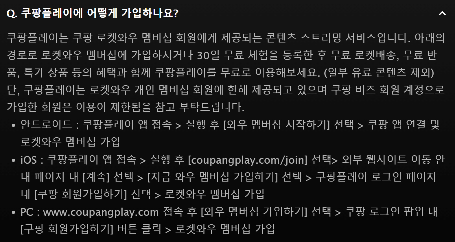 쿠팡플레이는 쿠팡와우 회원에게 제공되는 쿠팡의 OTT 서비스로서 다양한 방송을 스트리밍 해주고 있습니다. 첫 달은 무료로 시작할 수 있으며 아래의 방법에 따라 가입할 수 있습니다.