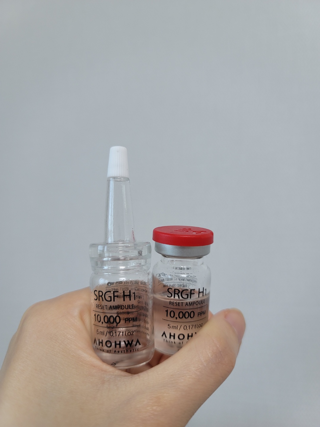 그러다가 아오와의 앰플을 체험할 수 있는 기회로, 발효 콜라겐 같은 여러 가지 특허성분뿐만 아니라 핵심 보습 성분이 들어 있는 리셋 앰플(SRGF H1 RESET AMPOULE)을 쓰게 되었어요.