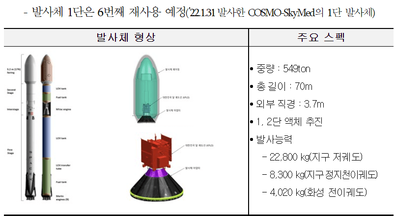 발사체 팰컨9(Falcon-9) 다누리(KPLO) 단독 발사(아래의 발사체에 다누리 탑재)
